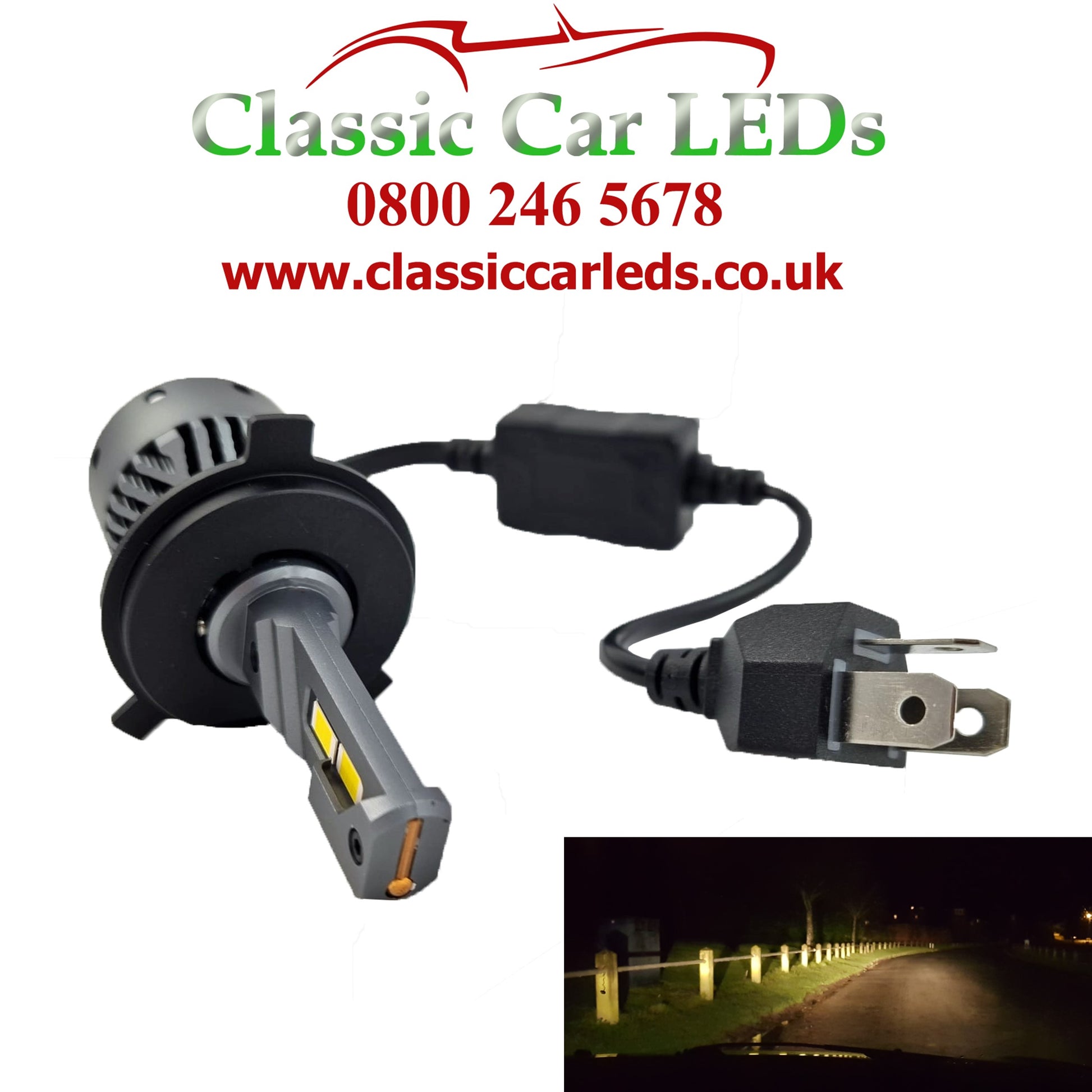 This is a pair of top quality, H4 LED headlights made with the latest high power SMDs which produce a clean focused light with no glare and a very well defined beam that replicates the low and main beam pattern of a standard H4 halogen bulb when fitted to the appropriate headlight reflector.
