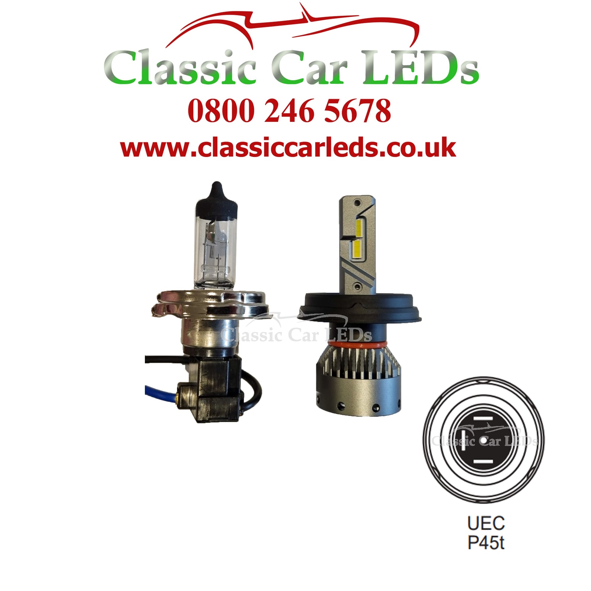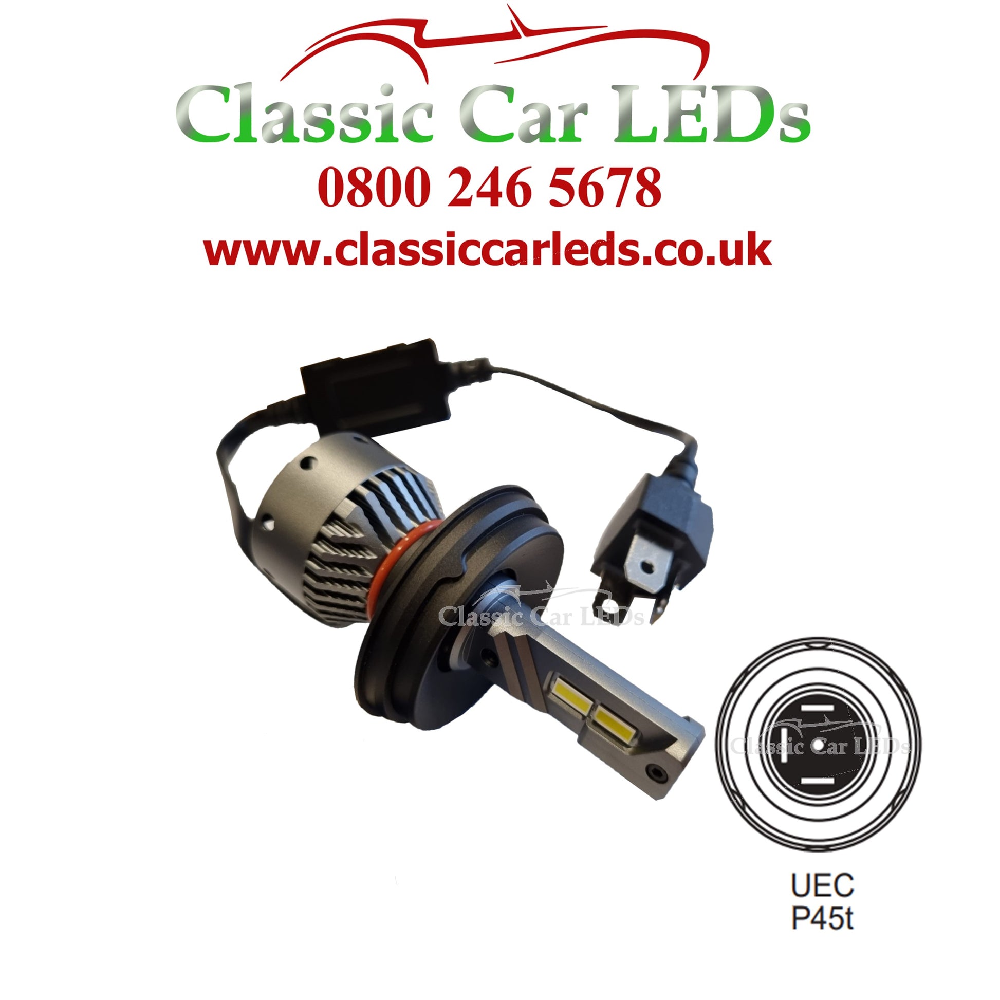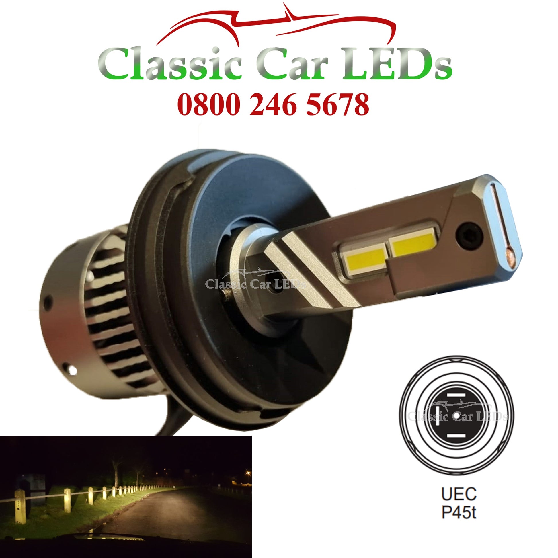 This is a pair of top quality LED headlights made with the latest high power SMDs which produce a clean focused light with no glare and a very well defined beam that replicates the low and main beam pattern of a standard P45T halogen bulb when fitted to the appropriate headlight reflector. These are a direct fit LED that do not need adapters and sit securely in P45T fittings.